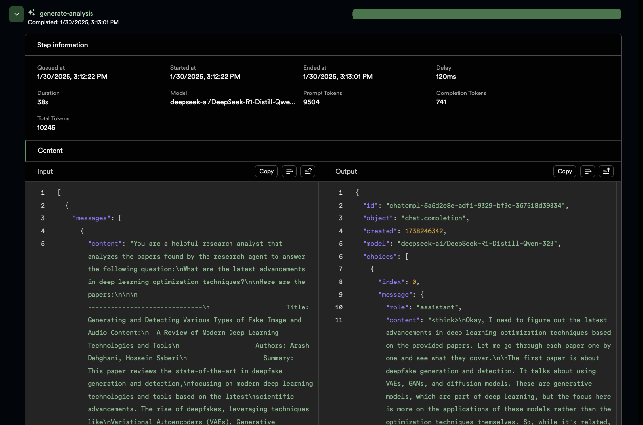 Now, look at a more advanced example: testing DeepSeek-R1 Qwen 32B's large context window and Agentic capabilities.