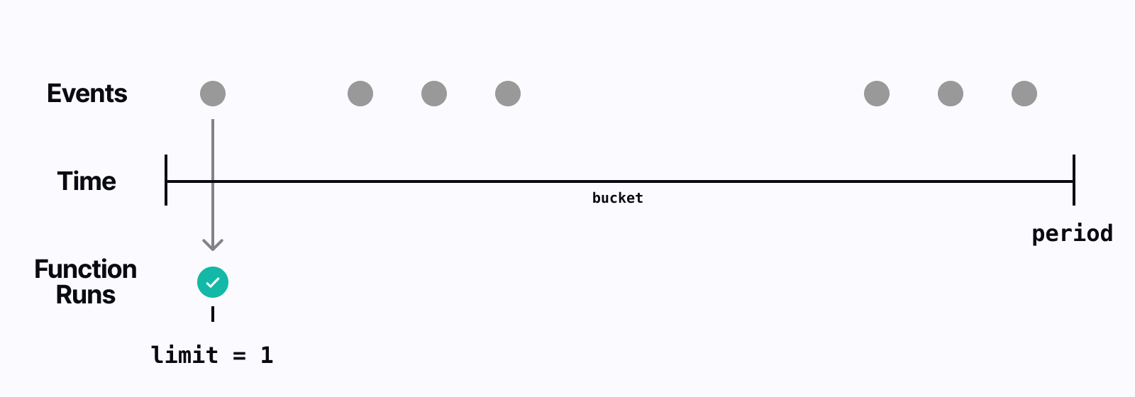 For example, this means that for a limit: 10 and period: '60m' (60 minutes), the bucket time window will be 6 minutes. Any event triggering the function "fills up" the bucket for that time window and any additional events are ignored until the bucket's time window is reset. The algorithm (GCRA) is more sophisticated than this, but at the basic level - rateLimit ensures that you'll only run the max limit number of items over the period that you specify.