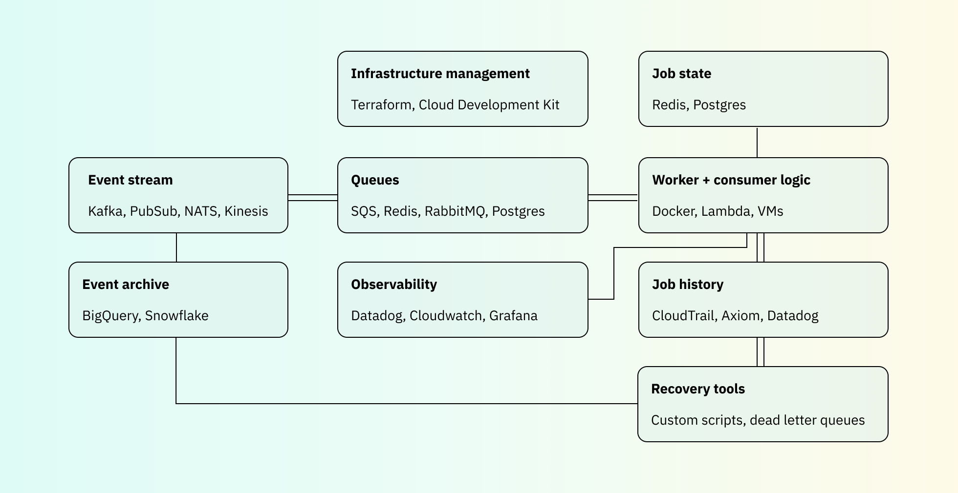 The Inngest platform combines multiple components that software teams typically would have to create, combine, and maintain into a single architecture. We've combined everything that you need into a single, cohesive platform solution.